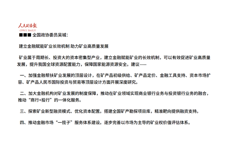 全國政協(xié)委員吳城:建立金融賦能礦業(yè)長效機(jī)制 助力礦業(yè)高質(zhì)量發(fā)展