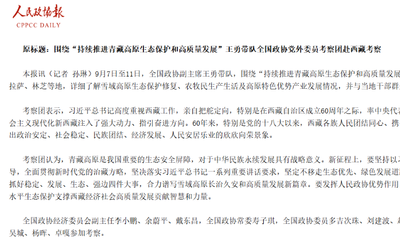 9月7日至11日,全國政協(xié)副主席王勇帶隊(duì),圍繞“持續(xù)推進(jìn)青藏高原生態(tài)保護(hù)和高質(zhì)量發(fā)展”...